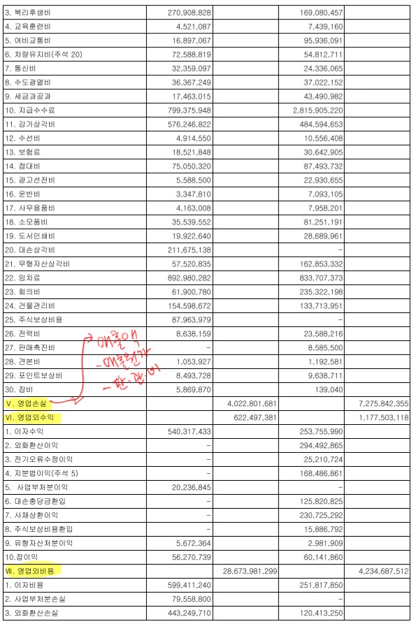 최종적으로 회사가 남긴 금액이다. 손실로 기록되어있음을 확인해보면 최종 320억의 엄청난 적자를 기록하였음을 확인가능하다.