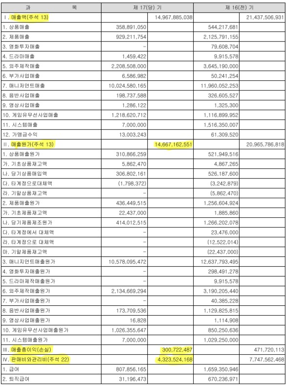 지금까지 본 3에서 4를 제한수치(1-2-4와 같다). 자! 보자 매출액 약 150억을 기록했다하더라도 보고서에서 영업이익이 아닌 영업손실로 기록되었다. 즉, 이 회사는 해당 기간동안 40억의 적자를 기록하였다. --> 특별한 투자를 하는 회사도 아니고 엔터테인먼트로 영업을 했는데 계속해서 마이너스 수치를 기록하면 앞으로 잭팟이 터질것은 크게 기대하지 않는게 좋다.